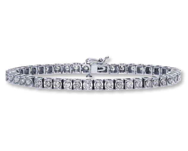 This exquisite bracelet for her sparkles with stunning round diamonds for optimal brilliance. Set in 14K white gold, the fine jewelry bracelet is secured by a tongue clasp and has a total diamond weight of 3 carats.