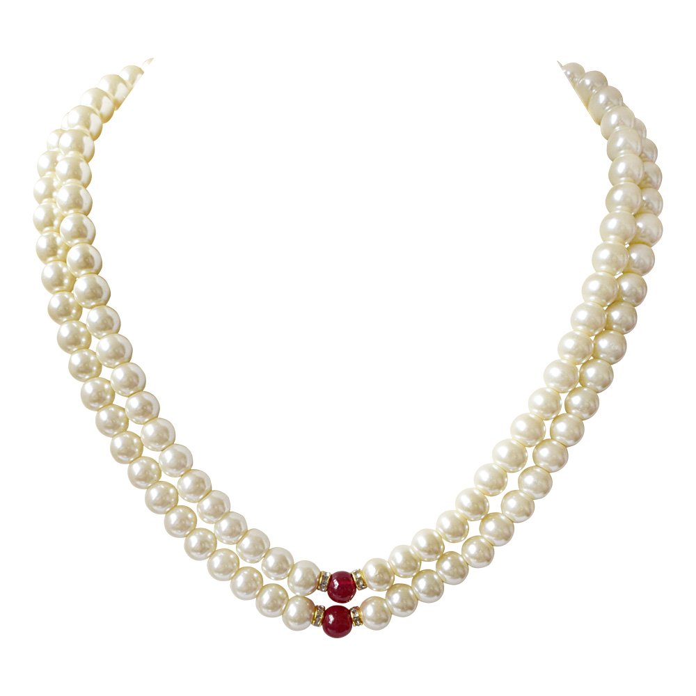 SURATDIAMOND 2 Line White Shell Pearl and Red Stone Necklace Set